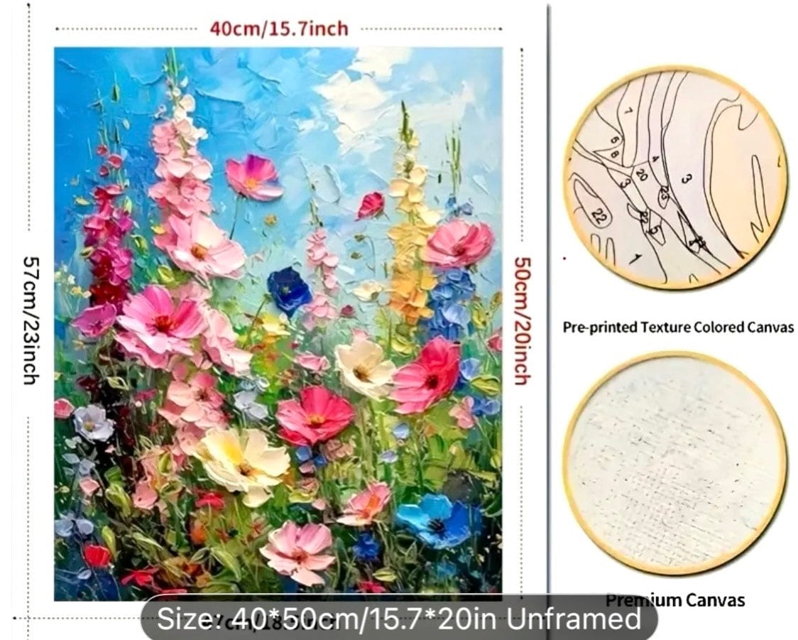 A DIY Adult Beginner'S Digital Painting Kit, Perfect As an Art Gift, Featuring Easy-To-Follow Numbered Painting Instructions. It Includes Acrylic Paints, a Canvas, Three Brushes, And a Manual. The Acrylic Artwork Showcases Vibrant Flowers Blooming Against a Blue Sky Backdrop, Measuring 40X50Cm Or 15.7X20 Inches, Unframed.
