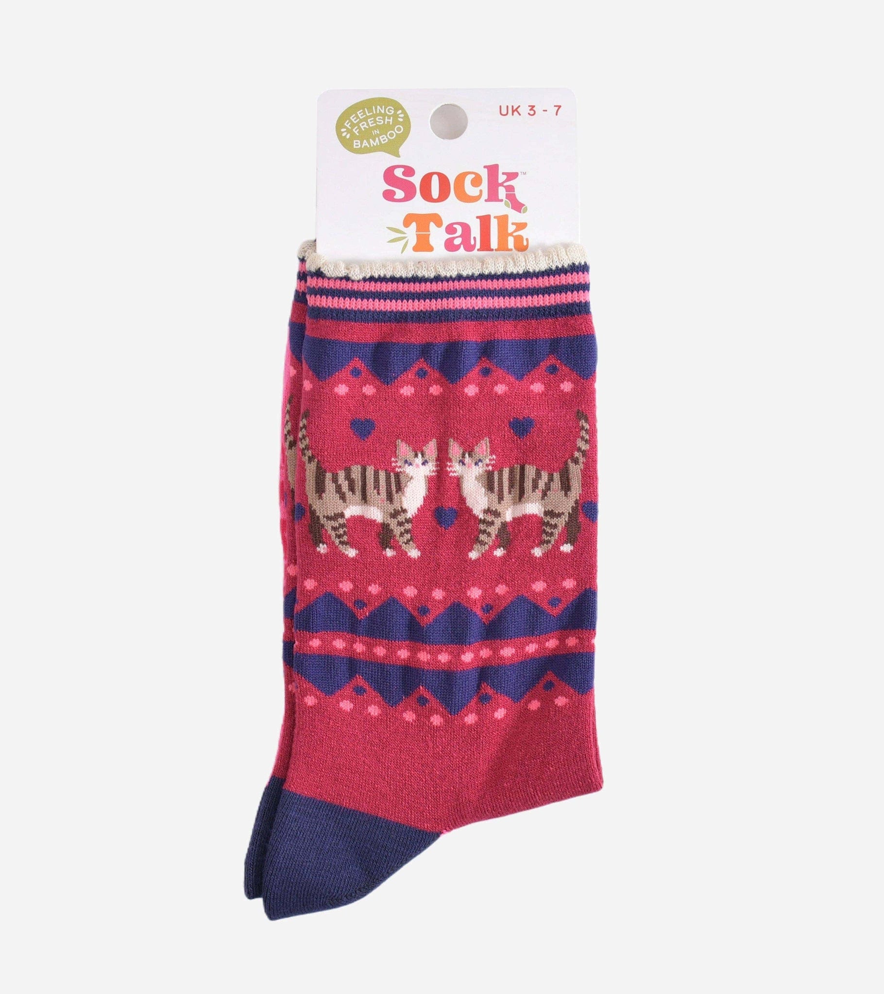 Crafted from soft eco-conscious bamboo, these Fair Isle inspired socks are designed to feel luxuriously soft. Showcasing a pair of playful tabby cats and contrasting pink and navy blue accents.