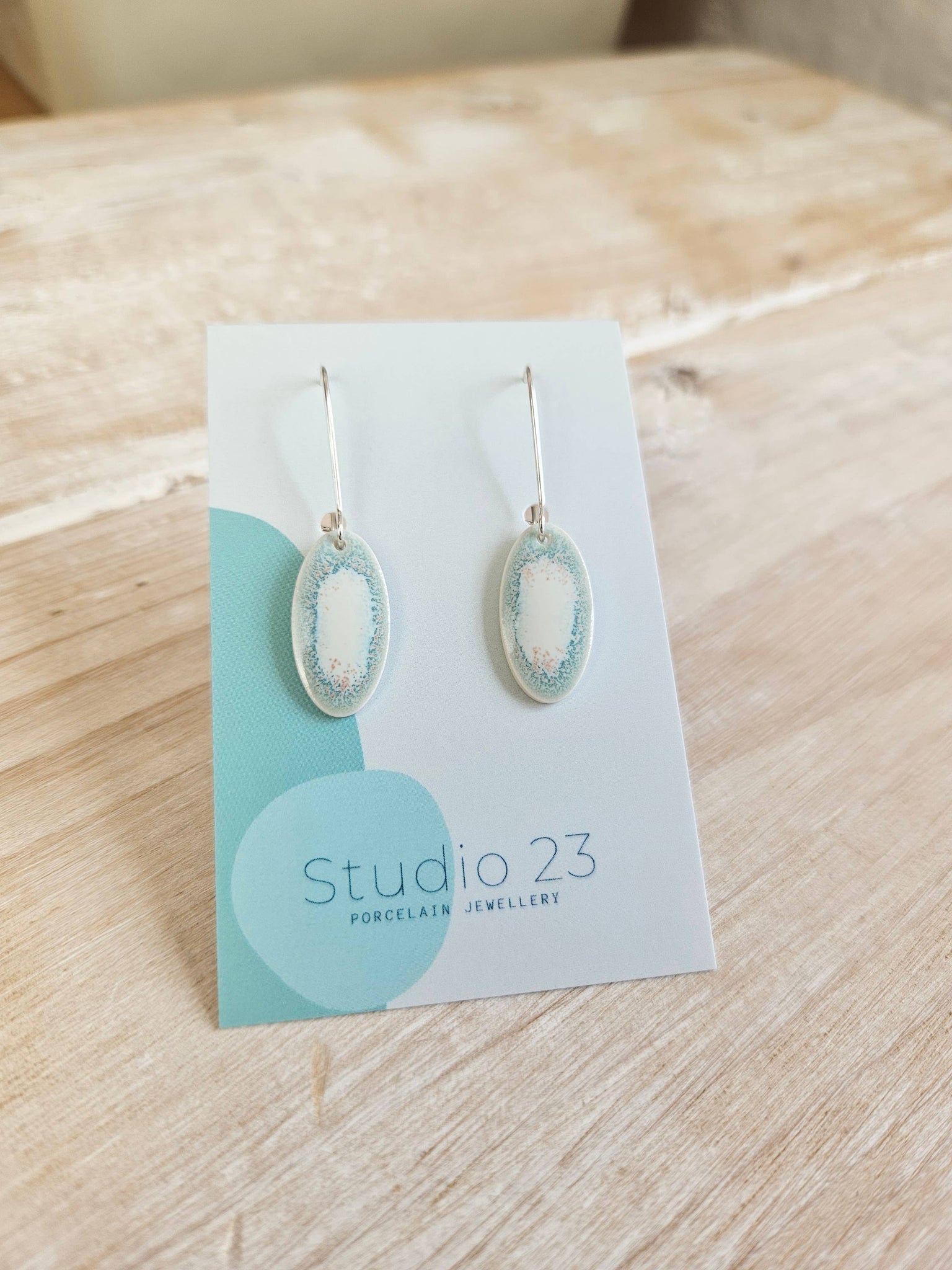 Pair of oval porcelain clay drop earrings glazed in a range of decorative pastel stoneware glazes. The drops are approximately 22mm in length and 12mm in width and have silver-plated hoops and come presented on a coloured matte card ready to display.