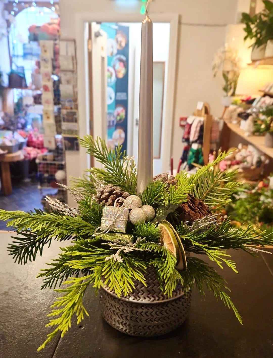 Made up of a combination of Fresh Festive choice of Christmas colours, dried oranges, Lemons, Cloves and Cinnamon which not only would look good but will smell yummy too!