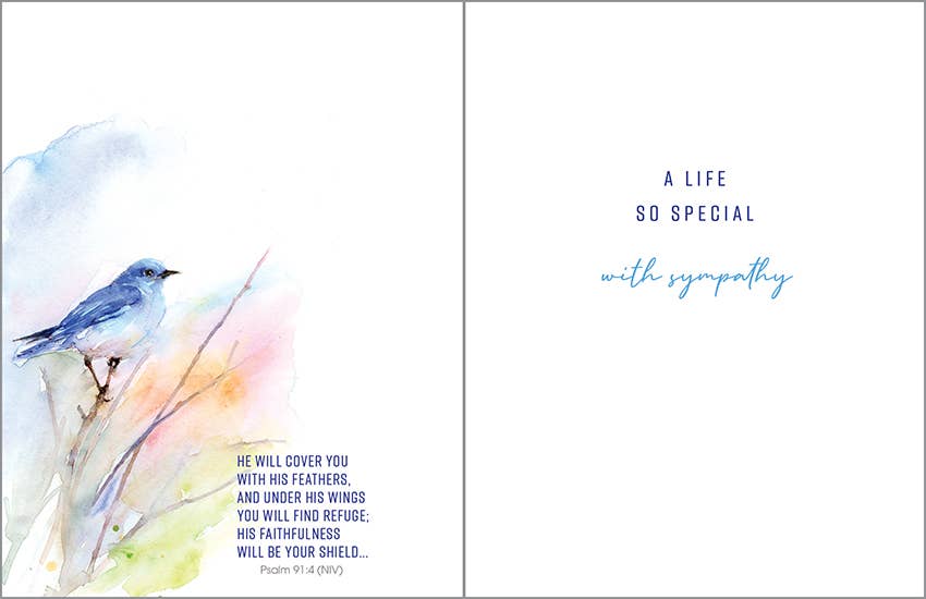 Greeting card with envelope honoring celebrating remembering A life so special with sympathy (Psalm 91:4 NIV) Folded size: 4.25" x 5.5" (A2).